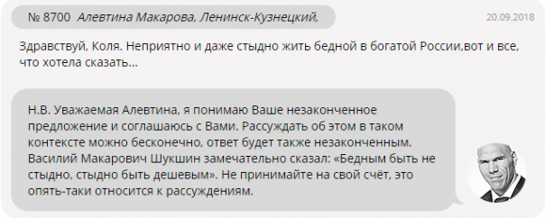 Жительница Кемеровской области Алевтина Макарова написала: "Неприятно и даже стыдно жить бедной в богатой России, вот и все, что хотела сказать…" Валуев ответил, что понял "незаконченное предложение", и согласился с автором.