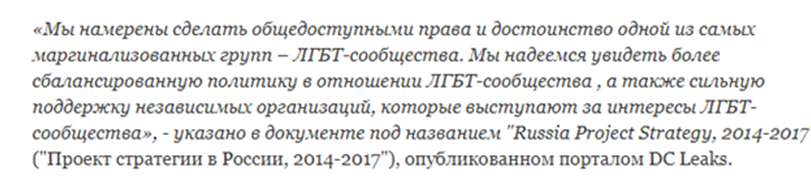Не будем забывать и о том, что тема секс-меньшинств активно используется в программе Джорджа Сороса по дестабилизации обстановки в различных странах, в том числе и России.