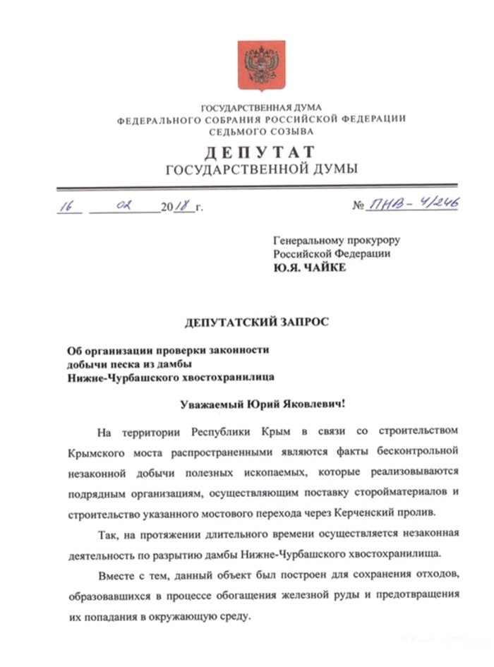 Напомним, о возможных негативных последствиях неконтролируемой разработки песков и шламов в районе хвостохранилища неоднократно заявлял в своих обращениях к правоохранительным органам и средствам массовой информации депутат Госсовета Крыма Юрий Юрьев. Также по данной проблеме в генеральную прокуратуру направлялся депутатский запрос от Натальи Поклонской.