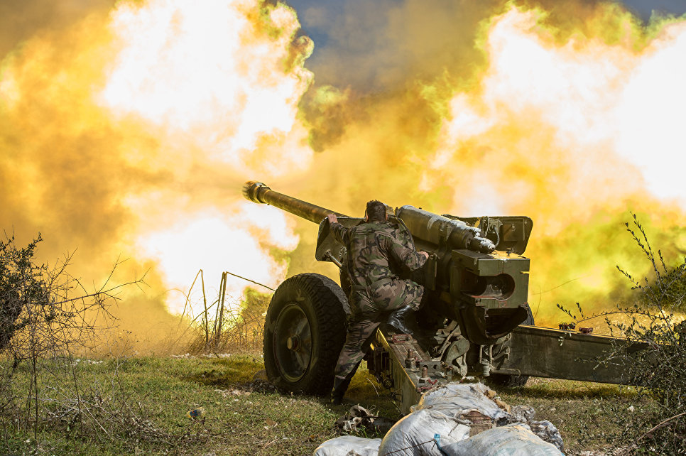 Артиллеристы сирийской армии ведут стрельбу на позициях в провинции Идлиб на северо-востоке Сирии