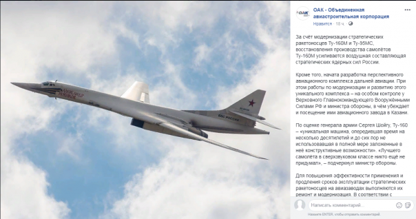 Кроме того, за счет модернизации стратегических ракетоносцев Ту-160М и Ту-95МС, восстановления производства самолетов Ту-160М усиливается воздушная составляющая стратегических ядерных сил.
