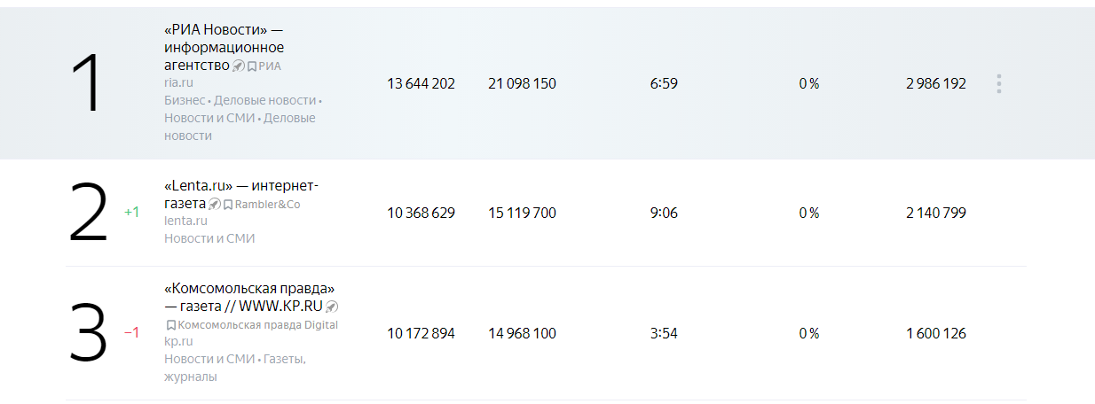 Посмотрите сами. Первое место занимает информационное агентство «РИА Новости», что не вызывает нареканий, потому что данное издание определенно вызывает доверие. Второе место занимает «Лента» - тоже нормальный сайт. Третье – «Комсомольская правда». Ну, положим.