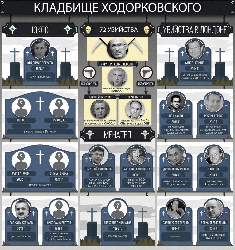 Ещё с 90-х Ходорковский взял в оборот схему, согласно которой он привлекает на свою сторону выгодных ему людей ( в частности и для отмыва денежных средств), а затем занимается их ликвидацией. Списанных в тираж, как ненужный ресурс, либеральных друзей олигарха можно похоронить на отдельном кладбище. На Западе все прекрасно знают о том, что представляет собой прожженный преступник, которого уже давно ожидает российский суд.