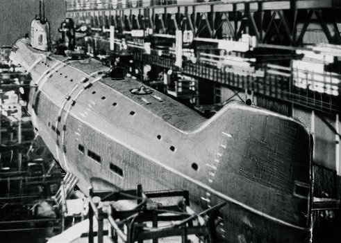 Подводная лодка К-3 в стапельном цехе (1957 г.)