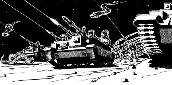 Почти такими же ракетными ружьями, только на турелях, «Стажёры» Стругацких истребляют с песчаных танков марсианских летающих пиявок: