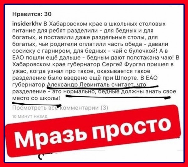 В комментариях люди рассказывают совсем уж дикие истории. Например, в одной из поселковых школ детей, родители которых оплачивают питание, сажают за отдельный стол и дают на обед макароны с сосиской, а бедных детей сажают за другой стол и дают пустые макароны. Учительница, опубликовавшая этот пост, сообщила, что уже не выдерживает этого, поскольку не в силах видеть глаза голодных детей, с завистью наблюдающих, как за соседним столом едят сосиски.