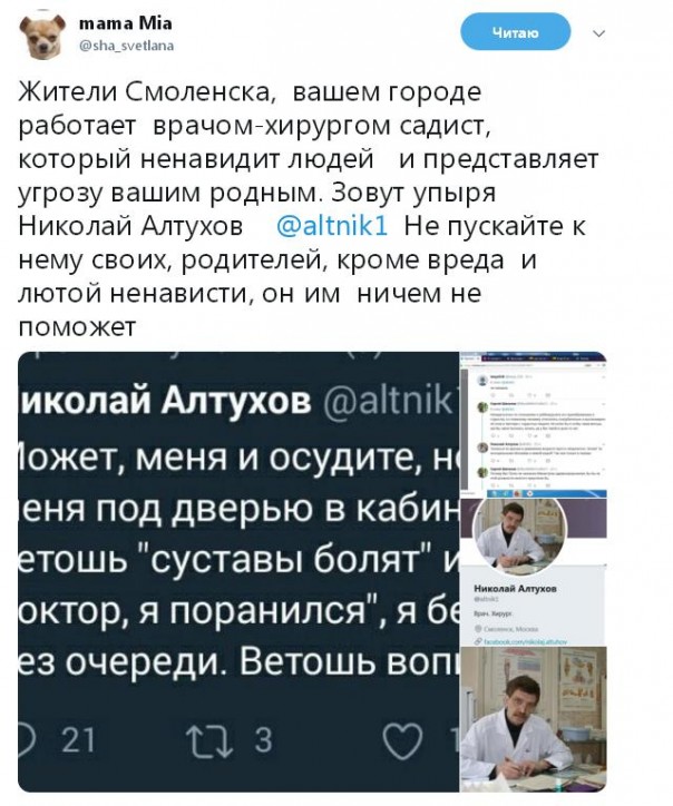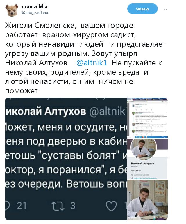 Есть такой блогер-медик по имени Николай Алтухов. Выпускник 1-го Московского медицинского института имени И. М. Сеченова. Врач-хирург. Живёт и работает в Смоленске (МЛПУ "Поликлиника № 6"). Сетевые поклонники именуют его "доктором всея Твиттера".