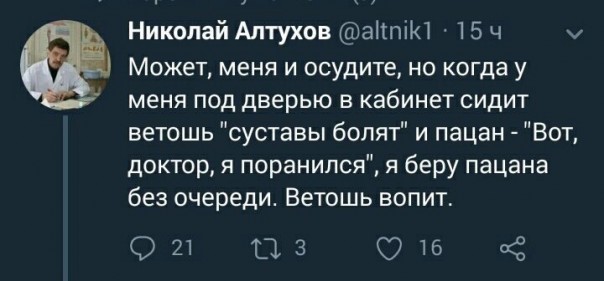 2 февраля, по случаю своего юбилея, Алтухов разоткровенничался в Twitter: "Может, меня и осудите, но когда у меня под дверью в кабинет сидит ветошь «суставы болят» и пацан — «Вот, доктор, я поранился», я беру пацана без очереди. Ветошь вопит".