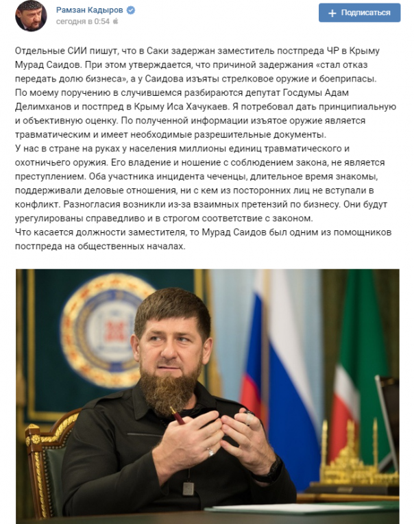 «По моему поручению в случившемся разбираются депутат Госдумы Адам Делимханов и постпред в Крыму Иса Хачукаев», — написал Кадыров на своей странице во «ВКонтакте». Чеченский лидер отметил, что потребовал дать принципиальную и объективную оценку произошедшему.