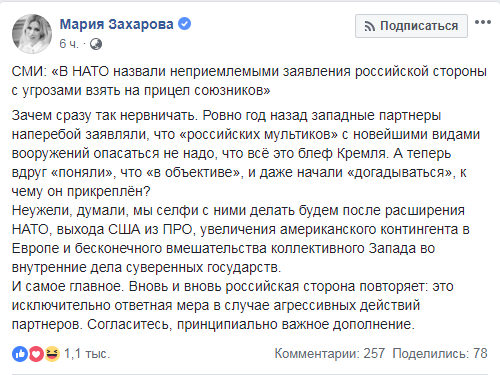 "Неужели, думали, мы селфи с ними делать будем после расширения НАТО, выхода США из ПРО, увеличения американского контингента в Европе и бесконечного вмешательства коллективного Запада во внутренние дела суверенных государств. Вновь и вновь российская сторона повторяет: это исключительно ответная мера в случае агрессивных действий партнеров. Согласитесь, принципиально важное дополнение", - добавила Мария Захарова.