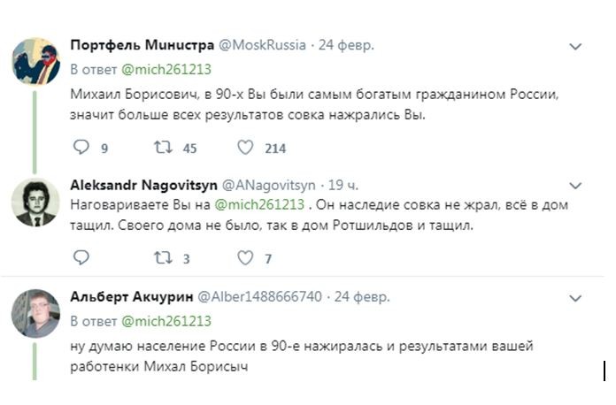 В частности, в одной из своих записей в Твиттере, он утверждает, что россияне, «нажравшиеся» в 90-х «результатов совка», «в 2000 юзали итоги 90-х».
