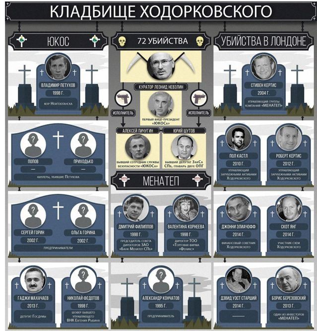 Подобную манеру ведения дел продолжил Ходоркоский и после своего отъезда на Запад. С 2004 по 2014 годы в Лондоне умерло 7 человек, деятельность которых так или иначе была связана с олигархом.