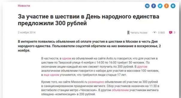 Можно вспомнить, например, как издание пыталось поднять свой рейтинг накануне Дня народного единства. Со ссылкой на Avito.ru оно заявило, что 50 человек, выразивших желание участвовать в шествии по Москве, получат денежное вознаграждение в количестве 300 рублей.