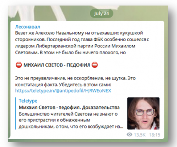 Отдельное внимание стоило бы уделить организатору сего циркового представления для узких кругов. Им является некий Михаил Светов, мечтающий выйти из тени Навального. Правда, молодой человек выступает из своих личных интересов. Дело в том, что он уже давно и открыто признался в своих наклонностях педофила, рассказывая как в 26 лет сожительствовал с 15-летней девочкой.