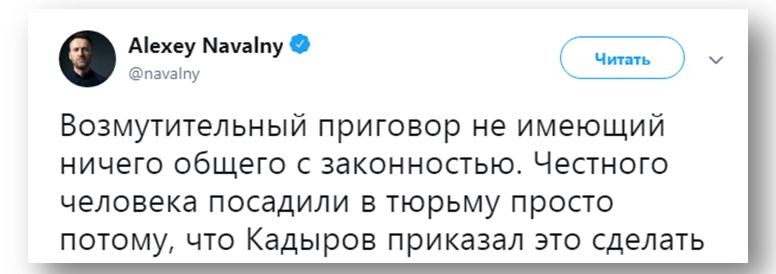 На эту новость сразу же откликнулся блогер Алексей Навальный, назвавший Титиева «честным человеком». Приговор, по его мнению, «возмутительный».
