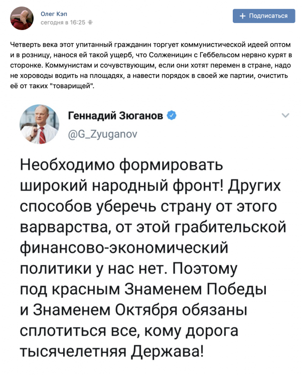 Что бы там кто ни говорил про народную любовь к неоспоримым преимуществам социализма, Советский Союз "добрые люди из-за лужи" развалили именно на массовом подсознательном желании населения "все общее поделить". Цена последствий выяснилась сильно потом и отношение к частной собственности в обществе стало меняться, но кукловоды происходящих перемен не ощущали. Лишь фиаско "на Болотной" показало, что либеральные демократические ценности свою привлекательность утратили и надо нащупывать новые точки.