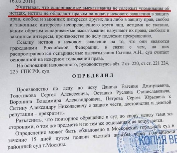 Я напомню, что суд тогда отклонил наши иски. Мне и другим было отказано потому, что суд счёл, что заявления Сытина о «национальной склонности русских к лени, насилию, пьянству и кровосмешению» и о том, что Россия – это якобы «террористическое государство», не касаются лично нас.