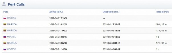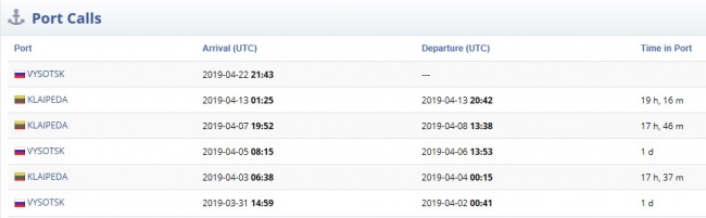Судя по данным навигационного портала Myshiptracking, все рейсы в Клайпеду в апреле из Высоцка осуществил газовоз Coral Anthelia.