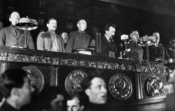 Секретарь ЦК ВКП(б) Вячеслав Молотов, нарком по военным и морским делам Климент Ворошилов, председатель СНК СССР и СНК РСФСР Алексей Рыков, начальник Политуправления РККА Андрей Бубнов, секретарь ВЦСПС Андрей Андреев (справа налево) в президиуме XV съезда ВКП(б)