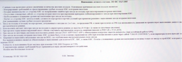 Кроме того, вызывает вопросы и странная политика Аэрофлота в отношении ручного и автоматического пилотирования этого самолета. Я уже говорил, что пилотов фактически лишают возможности улучшить свои навыки, навязывая обязательное использование автоматики. Со мною связывались действующие пилоты Суперджетов, благодарили за то, что наша редакция защищает отечественный самолёт. Один из пилотов прислал фото распоряжения командира лётного отряда воздушных судов SSJ-100.