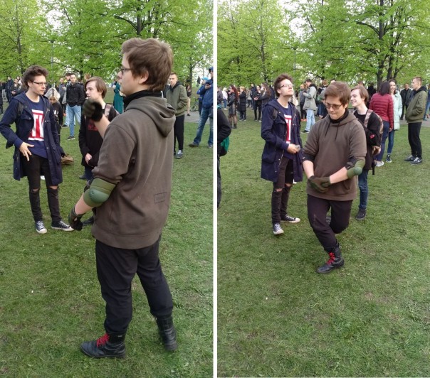 Первый вопрос, который задают люди, это "правда ли это майдан или просто дети хотят сквер". Это правда Майдан. Канонический. Тонкошеие детки, девочка с виолончелью (в последний момент рояль решили заменить), семилетний ребенок на заборе под щелканье камер, раздача вкусного кофе, боевки с битами в защитной экипировке. Собрались люди со светлыми лицами за все хорошее, они "просто устали терпеть эту власть". Их разбавляют более суровые и возрастные граждане в красных куртках, сотники. Но все совпадения, как вы понимаете, случайны. Это то, что мы видели вчера. Например вот мальчик отрабатывал удары со своим другом, фото №1: