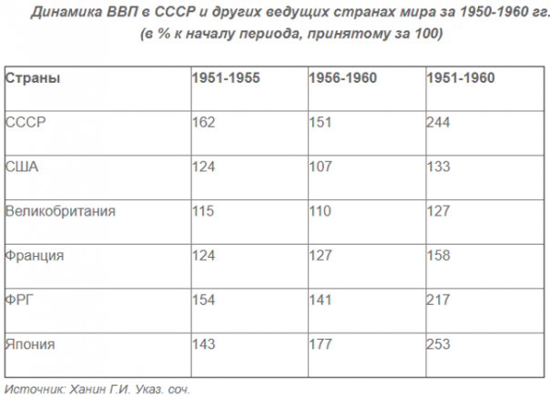 По динамике ВВП СССР в рамках всего десятилетнего периода 1951-1960 гг. среди 6 ведущих стран мира был на втором месте, уступая лишь Японии. Причём отставание от Японии было минимальным. Как справедливо отмечает Г.И. Ханин, сравнение с Японией не вполне корректно, поскольку Советский Союз к началу 1950-х гг. уже закончил послевоенное восстановление экономики, а Япония находилась в самой активной фазе такого восстановления.