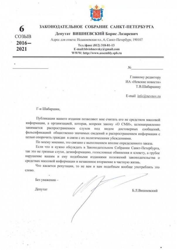 Издание НЕВСКИЕ НОВОСТИ направило Вишневскому запрос с просьбой разъяснить происходящее. Журналисты спросили, почему ЗакС ничего не предпринимает касательно сложившейся ситуации.