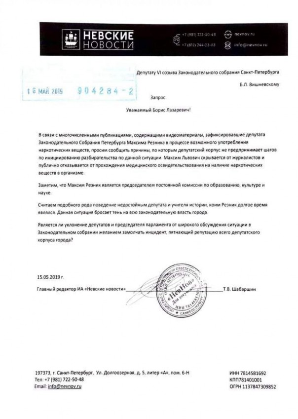 Вместо нормального ответа Вишневский начал обвинять НЕВСКИЕ НОВОСТИ в распространении слухов. Таким образом он пытается выгородить своего друга наркомана. Тем временем издание неоднократно приводило доказательства того, что Резник употребляет запрещенные вещества. Так о какой клевете может идти речь, если аргументы, так сказать, налицо?