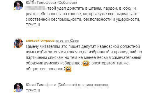 В Иванове депутат областной думы от КПРФ Юлия Тимофеева обматерила подписчиков в "Одноклассниках". Это случилось в комментариях под постом о том, что местные власти якобы не заботятся о ветеранах.