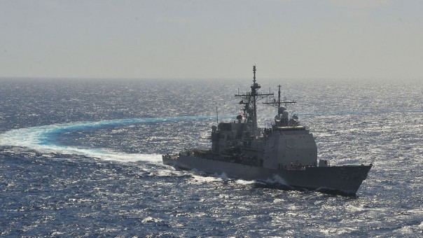 С другой стороны я не удивлюсь если сравнительно малый кильватерный след крейсера США говорит о краткосрочном рывке с целью пересечения курса нашего корабля (впрочем там могли профотошопить снимок). Они что? Стояли? Так не стояли же а шли параллельными курсами Там должно быть за кормой не огрызок кильватерного следа а нечто в стиле: