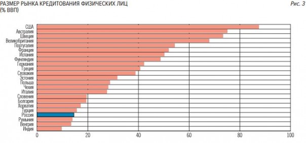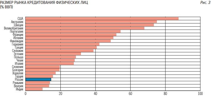По величине рынка потребительского кредитования (включая ипотеку) относительно ВВП Россия относится к группе стран с низким уровнем долга (14,3% от ВВП на 1 января 2019 г.). График, иллюстрирующий последний тезис: