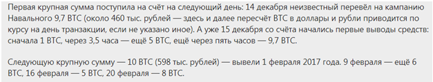 Кстати, Навальный мог не указывать в ФБК-ашном отчете доходы от биткоинов, но он не указал их в отчете по своей так называемой "избирательной кампании". О чем он думал, непонятно, ведь биткоин-кошельки находятся в открытом доступе. Поступление и вывод средств легко отслеживаются.