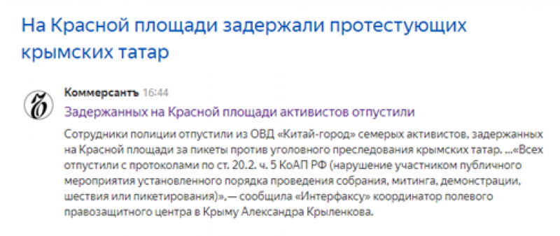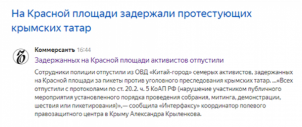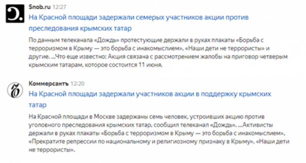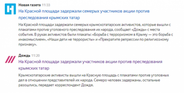 Сразу несколько прозападных СМИ («Новая газета», «Росбалт», Snob.ru, «Грани.ру», «Ведомости») со ссылкой на материал «Дождя» опубликовали статьи о задержании участников акции протеста против «преследования» крымских татар. Они вышли на Красную площадь с плакатами «Борьба с терроризмом в Крыму — это борьба с инакомыслием», «Прекратите репрессии по национальному и религиозному признаку в Крыму», «Наши дети не террористы».