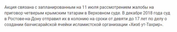 В итоге семь демонстрантов были задержаны и доставлены в ближайшее отделение полиции. Акция прошла накануне рассмотрения жалобы на приговор четверым членам террористической организации, которые в конце 2018 года были осуждены на сроки от девяти до 17 лет по делу о создании в Бахчисарае ячейки «Хизб ут-Тахрир».