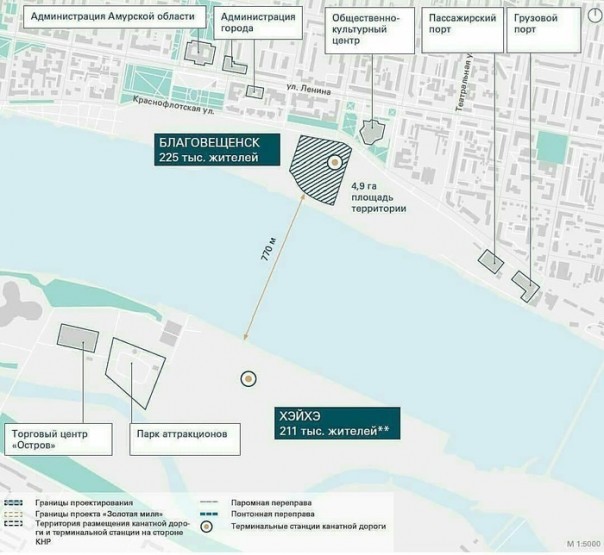 Канатная дорога протяженностью 973 метра пройдет над рекой Амур и во второй половине 2022 года свяжет Благовещенск и Хэйхэ, путь по воздуху между двумя странами будет занимать шесть минут. Символический старт проекту дали на барже посреди реки. После нажатия кнопки "пуск" одновременно в Китае и России началась заливка бетонных оснований международных терминалов.