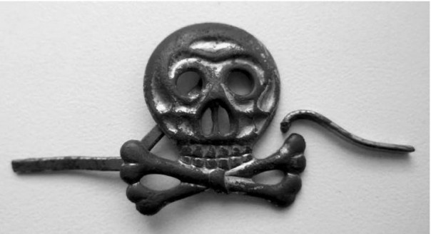 Вернемся, однако, в Германию. А там существовала еще одна «мертвая голова», брауншвейгская. Брауншвейгская «мёртвая голова» несколько отличалась от прусской — череп был повёрнут лицом прямо вперёд, а кости располагались непосредственно под ним.