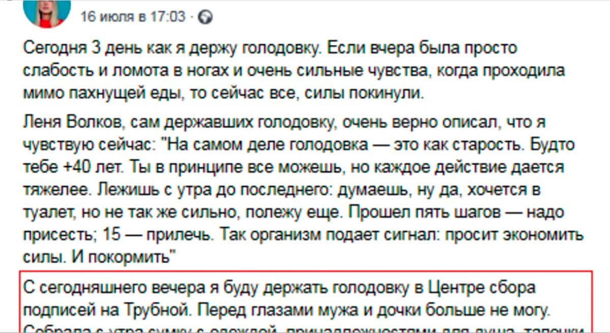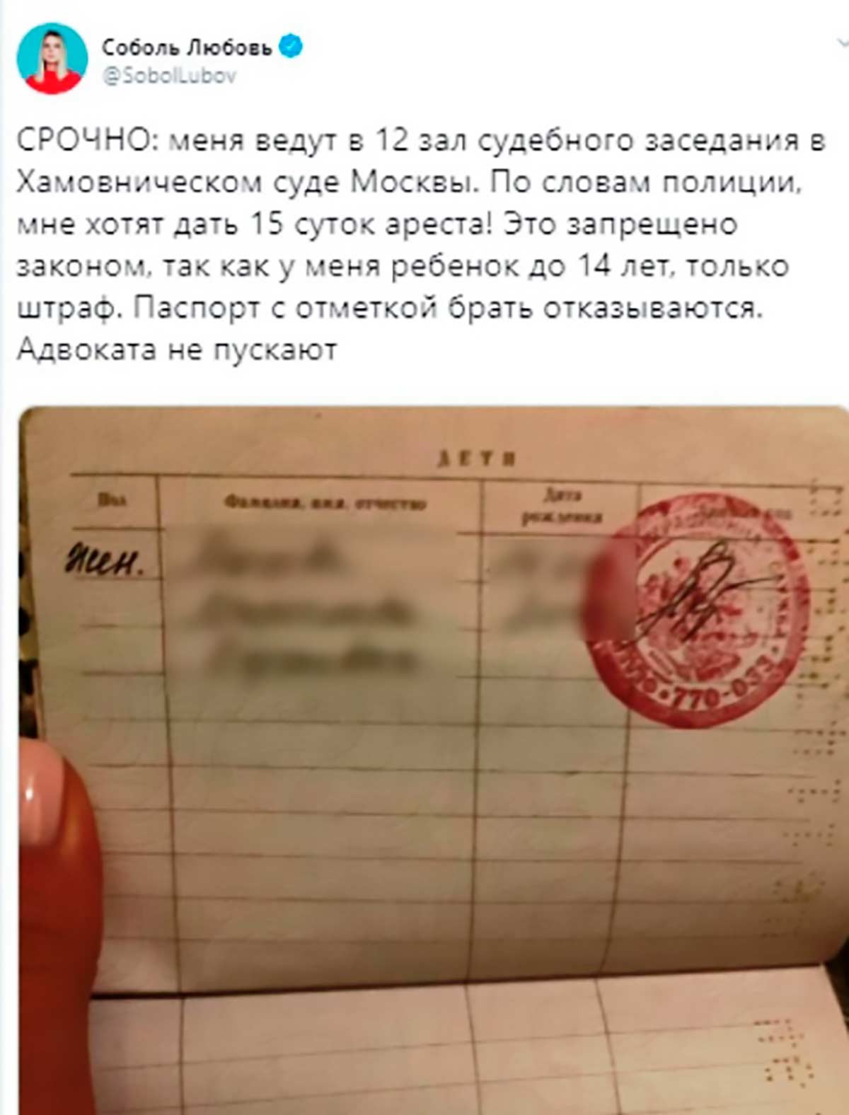 Но Соболь, к сожалению, нельзя назвать сознательной матерью. С 16 числа она под предлогом голодовки не ночует дома, рассказывая ребенку о том, что она «болеет» и ей плохо. Это, безусловно, вызывает у дочери страх потерять мать, который влияет на её психическое состояние. Да и многочисленные административные дела говорят о том, что женщина совершенно легкомысленно относится к закону, так как абсолютно уверена, что посадить её не могут. Поэтому она смело продолжает призывать людей к нарушению закона.