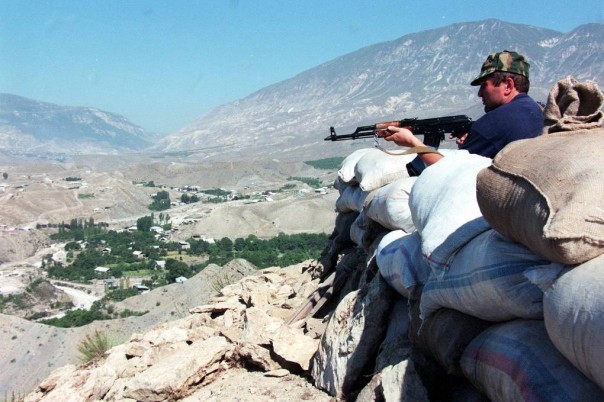 Ополченцы с высотных укреплений ведут перестрелку с противником, 19 августа 1999 года