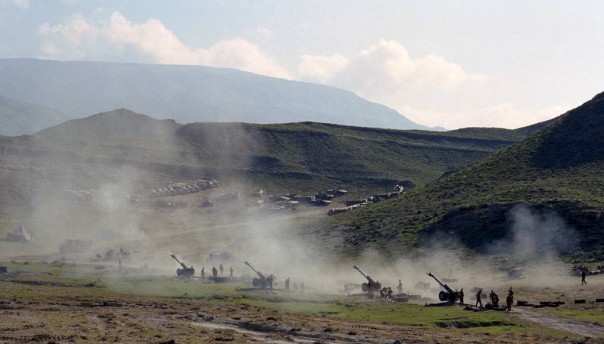 Батарея гаубиц Д-30 во время ведения огня по позициям боевиков в Новолакском районе Дагестана, 16 сентября 1999 года