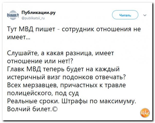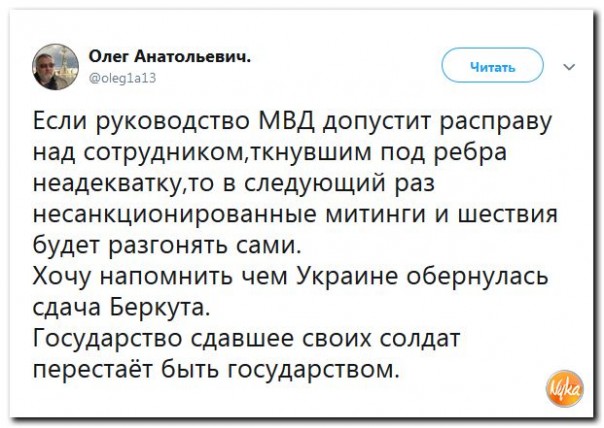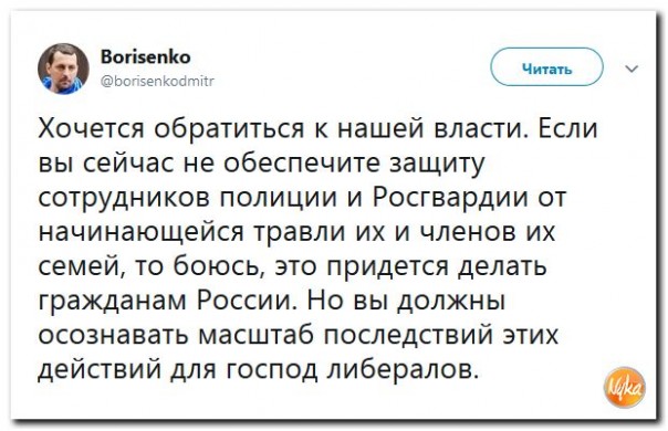 Почему остаются безнаказанными попытки травли людей, которые испытывают мощнейший стресс, выполняя свои служебные обязанности? Нет никому дела до отвратительных пасквилей, таких как «Лёха рукаст» и тому подобных, по сути разжигающих ненависть к людям не самой простой профессии, но избегающих за счёт собирательного образа юридической ответственности. Но почему нельзя объективно рассмотреть конкретный эпизод? И не только претензии заявительницы, но и её действия во время незаконной акции?