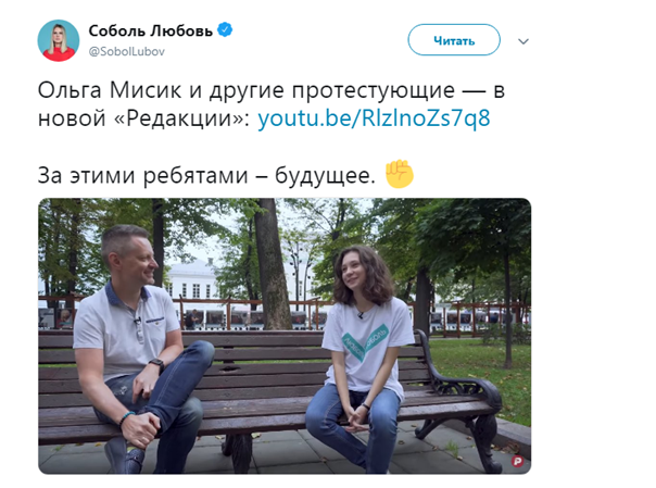 Она стала символом акции 27 июля, когда, заикаясь, читала сотрудникам ОМОНа Конституцию РФ. Правда, что именно она читала, было непонятно. Уже 10 августа девушка снова пришла на митинг с Конституцией. Затем устроила сидячую забастовку. А уже 17-го Ольга возглавила шествие подростков на Арбате. Пришла туда она, кстати, в «мерче» в поддержку Соболь.