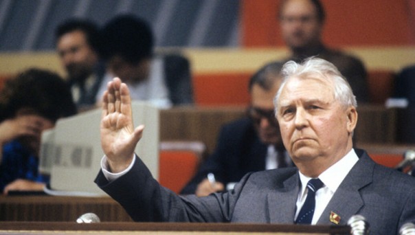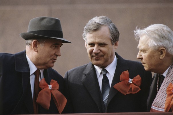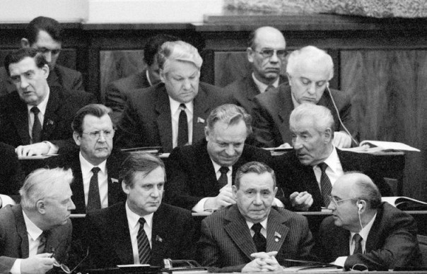 Члены и кандидаты в члены Политбюро на заседании Верховного Совета СССР, ноябрь 1986 года. Первый ряд, слева направо: Егор Лигачев, Николай Рыжков, Андрей Громыко, Михаил Горбачев. Второй ряд: Виталий Воротников, Лев Зайков, Михаил Соломенцев. Третий ряд: Владимир Долгих, Борис Ельцин, Эдуард Шеварднадзе.