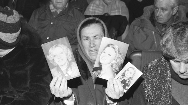 Галина Петровна Бессарабова во время показа фотографий своей дочери Людмилы, погибшей при столкновении сухогруза «Петр Васев» и круизного лайнера «Адмирал Нахимов». 12 марта 1987 года