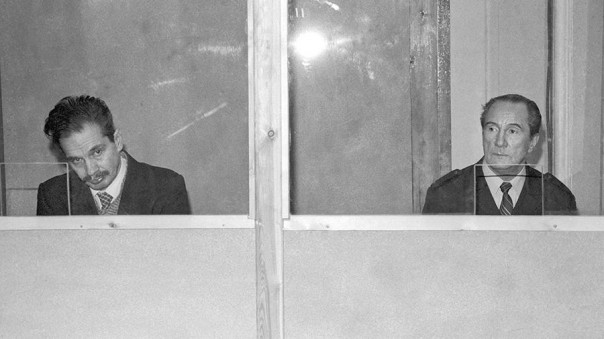 Бывшие капитаны Вадим Марков (справа) и Виктор Ткаченко, обвиняемые в столкновении пассажирского лайнера «Адмирал Нахимов» и сухогруза «Петр Васев», во время заседания судебной коллегии по уголовным делам Верховного суда СССР. 12 марта 1987 года