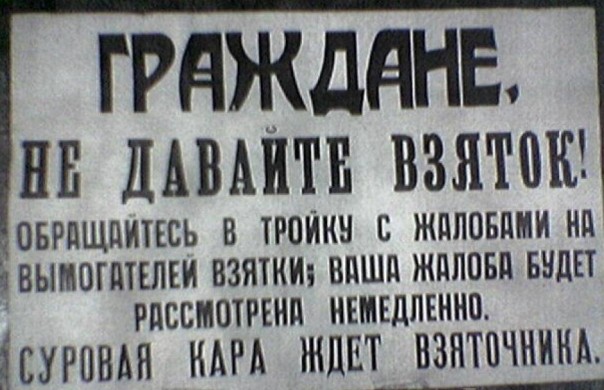 Взяточничество отнюдь не было искоренено ни Февральской, ни Октябрьской революциями. Уже в 1920-е годы прекрасно брали взятки и милиционеры, и чекисты, и партийные руководители, особенно на местах. Люди жили бедно и уровень коррупции был очень высоким, тем более, что на начальственные должности, в силовые структуры пришло большое количество случайных людей, «взлетевших» на волне революций и гражданской войны.