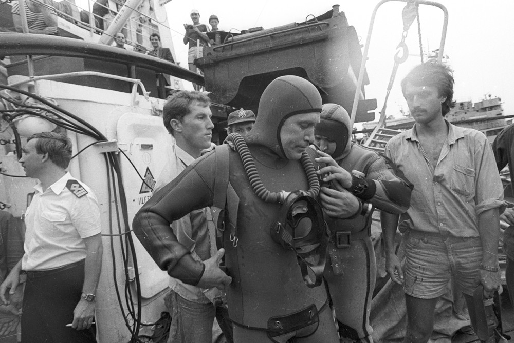 Водолазы спасательного судна «Аметист» перед погружением для поиска пропавших после гибели круизного лайнера «Адмирал Нахимов». 7 сентября 1986 года