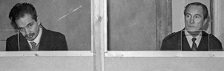 Бывшие капитаны Вадим Марков (справа) и Виктор Ткаченко, обвиняемые в столкновении пассажирского лайнера «Адмирал Нахимов» и сухогруза «Петр Васев», во время заседания судебной коллегии по уголовным делам Верховного суда СССР. 12 марта 1987 года