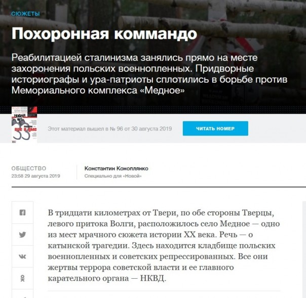 Вот и на днях либеральная «Новая газета» разродилась статьей с громким названием «Похоронная командо». Подзаголовок не менее кричащий:«Реабилитацией сталинизма занялись прямо на месте захоронения польских военнопленных. Придворные историографы и ура-патриоты сплотились в борьбе против мемориального комплекса «Медное».
