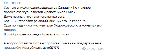 Армен Гаспарян обвинил эту контору в лицемерии, а Владимир Соловьев отметил, что петицию, которую сейчас распространяет это сборище, подписали только сотрудники медиа Ходорковского. Например, Александра Семенова и Александр Скрыльников из МБХ Медиа, Павел Гутионтов из «Новой газеты», Денис Катаев из «Дождя» и т.д.