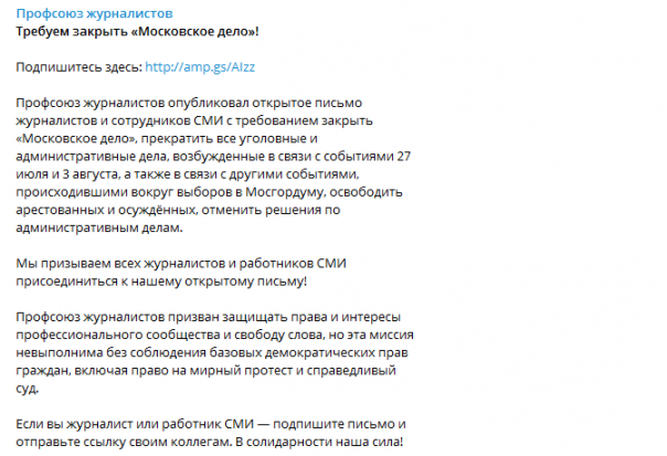 То же самое теперь происходит и с «Профсоюзом журналистов». О нем никто из известных журналистов не знает, но при этом организация распространяет петицию с требованием закрыть «московское дело».